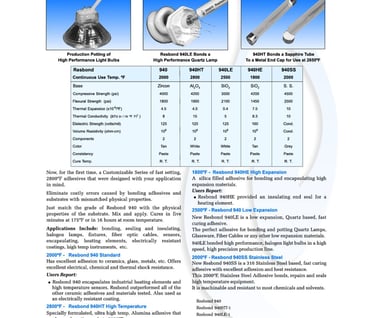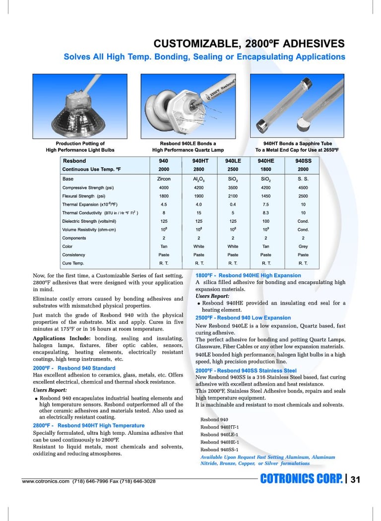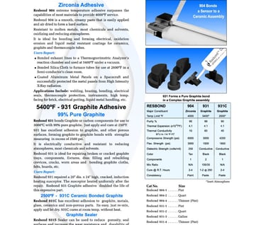Resbond 940 Standard. 2000 °F. Eccellente adesione a ceramica, vetro, metalli. ottima resistenza elettrica, chimica ed agli shock.